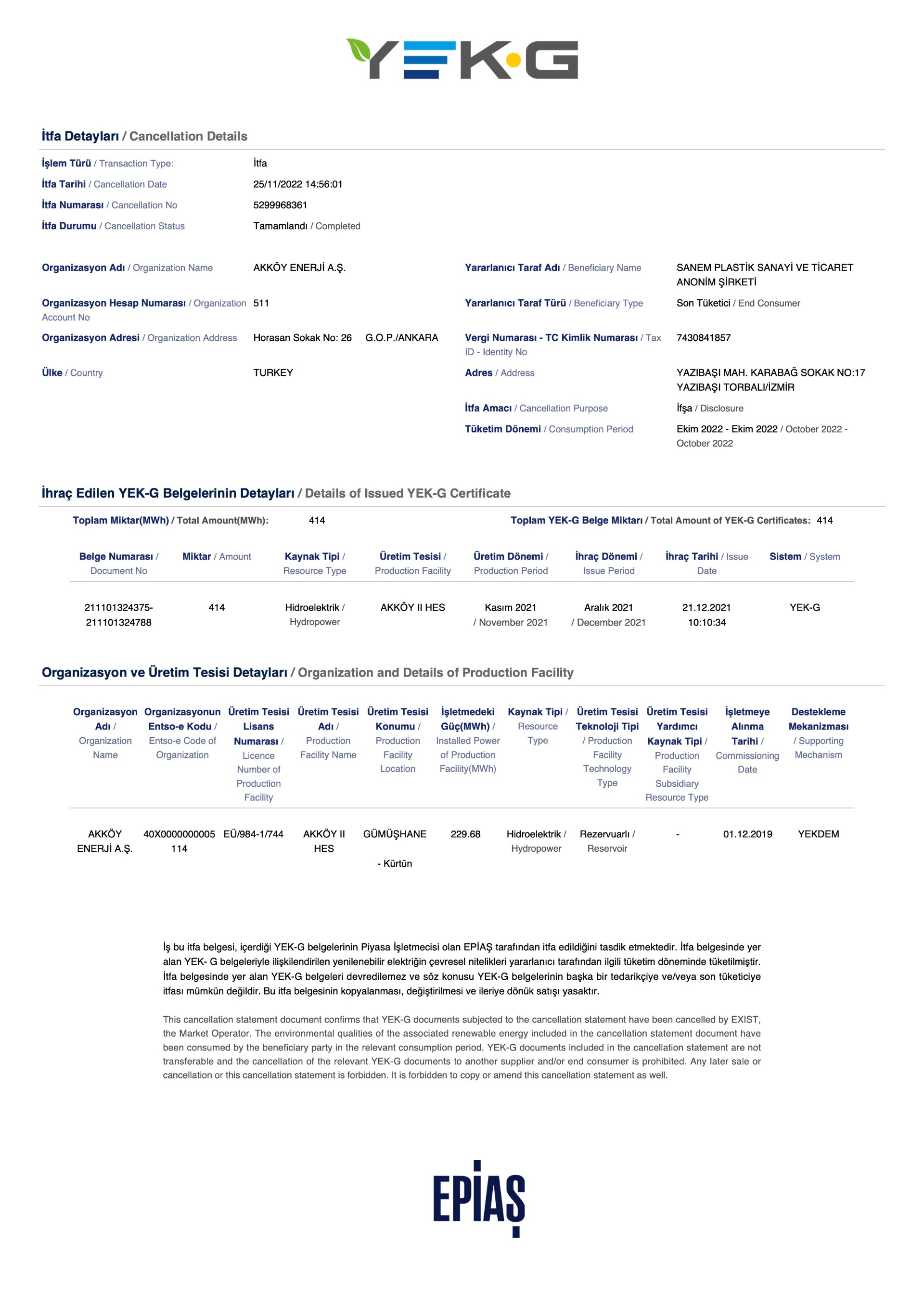 Yenilenebilir Enerji Kaynak Garanti Sertifikamız;